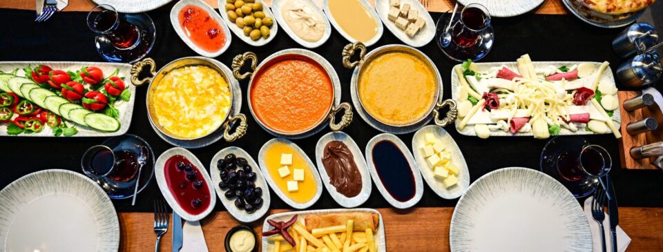 Siyah zeytin, Yeşil zeytin, Tahin pekmez, Bal, Tereyağı, Kakaolu fındık krema, Beyaz peynir, Kaşar peyniri, Topi peynir, Örgü peynir, Çeçil Peyniri, Domates, Salatalık, Kayısı, Ceviz, Kuru Üzüm, Patates Cipsi, Sosis, Sigara böreği, Sahanda yada rafadan yumurta, sınırsız çay