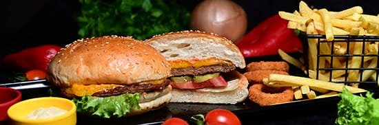 130 gr. Hamburger Köftesi, Karamelize Soğan, Cheddar Peynir, Marul Domates, Kokteyl Sos, Cips ve Soğan Halkası ile.