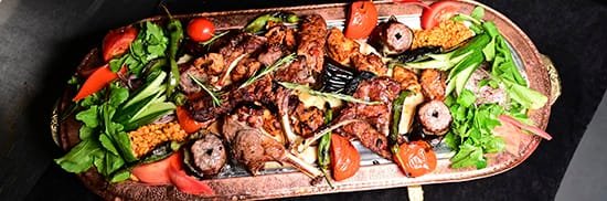 180 gr. Urfa Eti, Domates, Köy Biberi, Piyaz Soğan, Lavaş ve Bulgur Pilavı ile.
