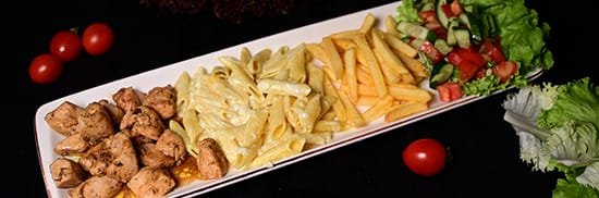 200gr renkli biberlerle sotelenmiş tavuk parçaları, pesto soslu penne makarna, patates cipsi ve mevsim yeşilliği eşliğinde.